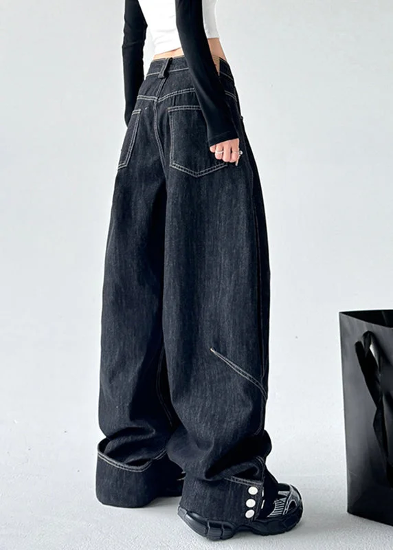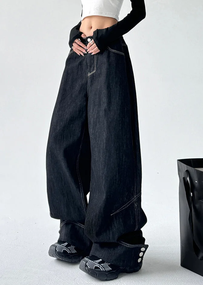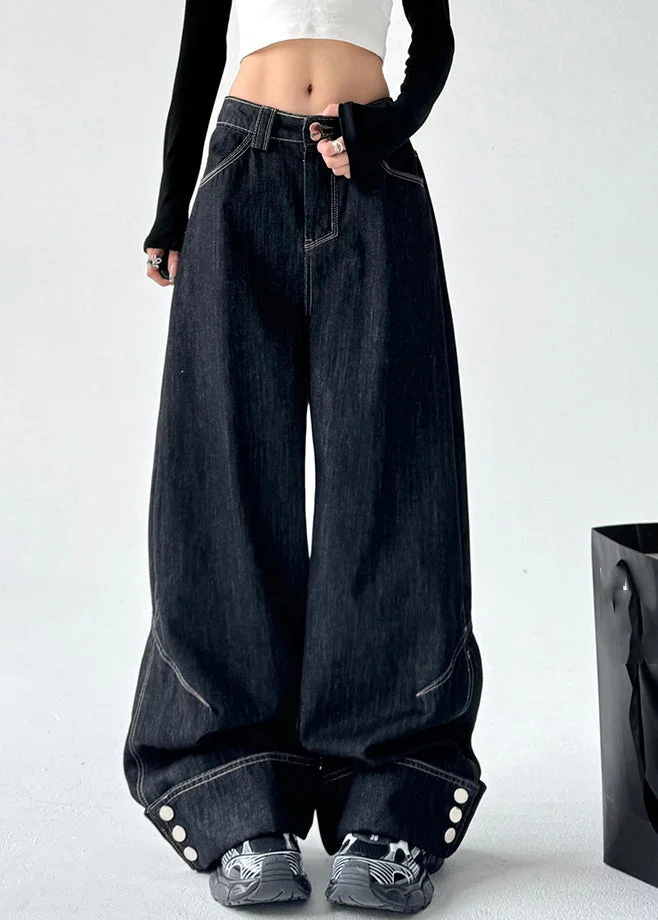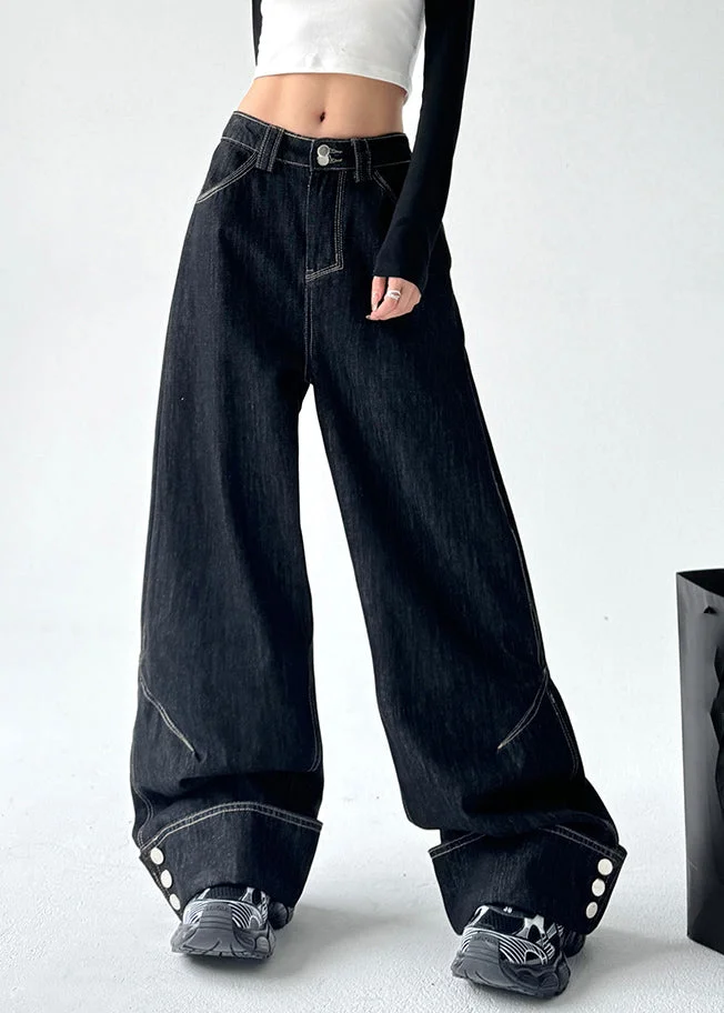 Plus Size Black High Waist Patchwork Straight Denim Pants Spring